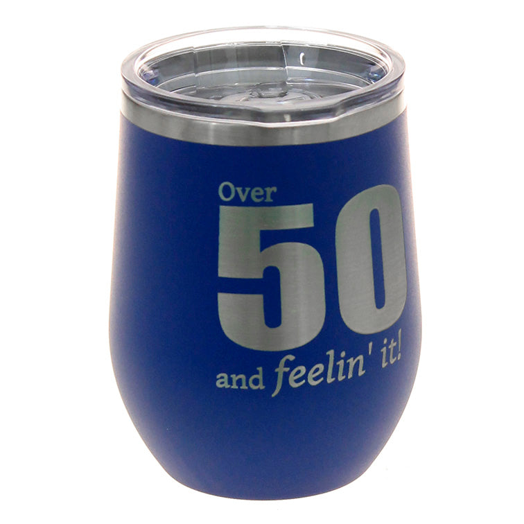 Getting old sucks! Over 50 we are really feelin' it... With this tumbler you can let them all know! Whether you want to keep your drinks hot or cold, this insulated tumbler is perfect for the job and features a fun design! Laser engraved design 12 oz. powder coated insulated stainless steel wine tumbler that includes a clear lid designed and engraved in the USA