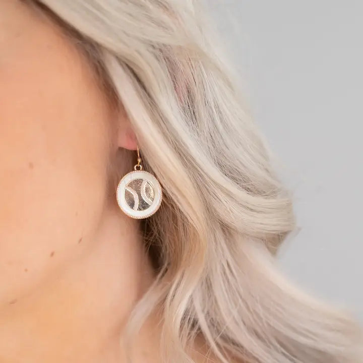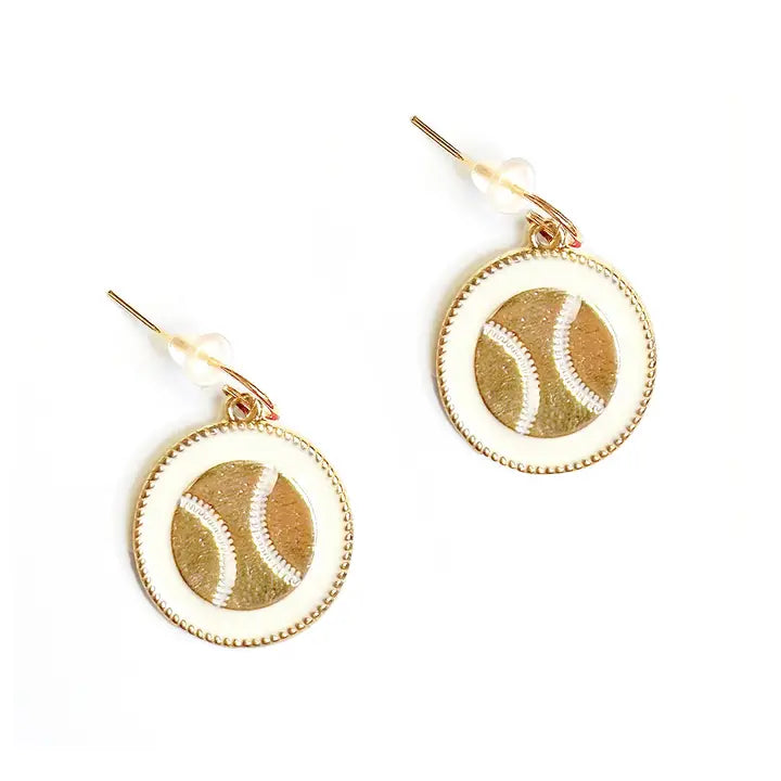 - These earrings feature a fun baseball design with white enamel and gold accents! 1.25” Disc White Enamel French Wire Earrings Gold Toned Metal Coordinating Necklace Available