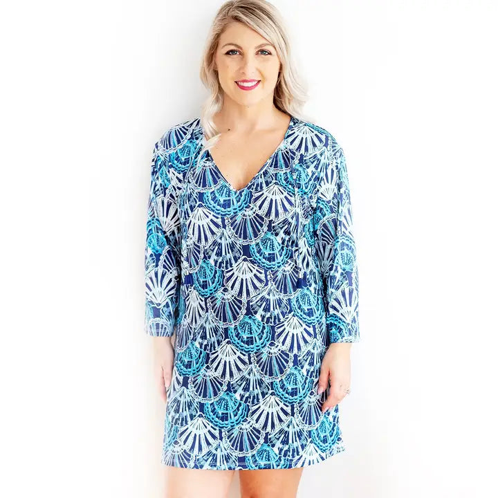This super cute Tunic not only looks great but feels great too! The fun pattern and easy pull-over design make this tunic ideal for shell hunting on the beach or walking on the boardwalk. Polyester/Spandex Blend 3/4 Sleeve Available in Sizes S/M(2-8), L/XL(10-16), and XXL(18-24) Decorative Tassel Ties Coordinating Beach Bag, Cooler Tote, & Beach Towel Available