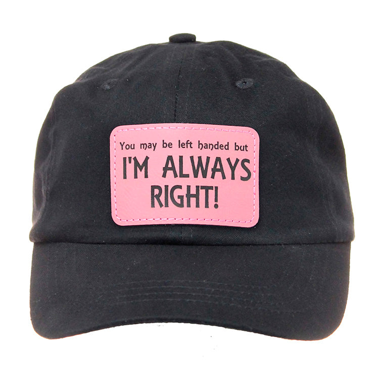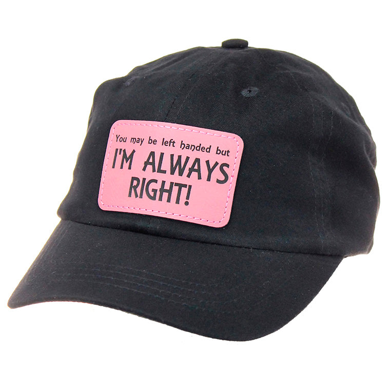 For all those right-handed people that feel they are always right. This is the perfect baseball cap with pink patch that are often working with left-handed people. This cap features a fun design and adjustable clasp for the perfect fit! A low-profile cotton blend baseball cap.
