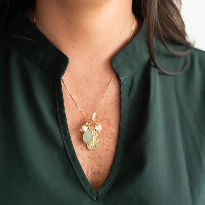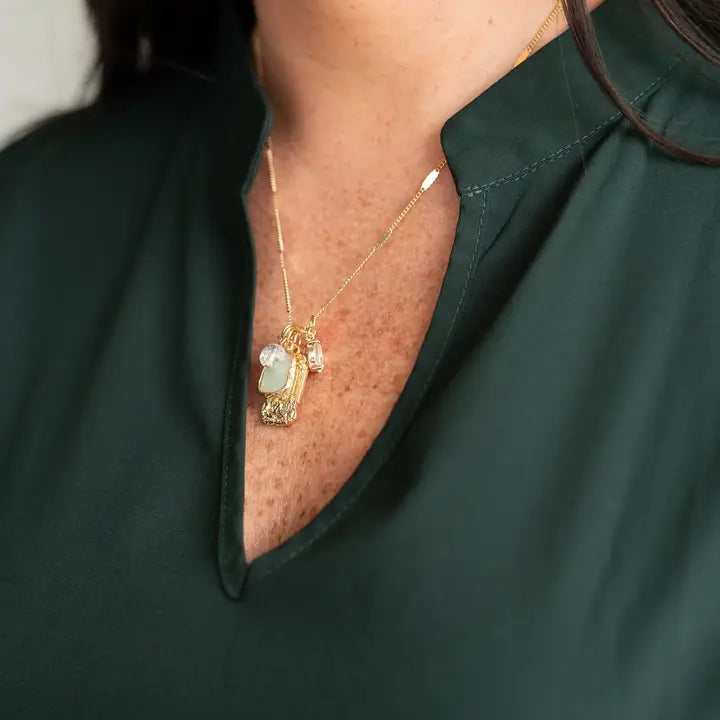 This necklace will quickly become your go-to accessory, it features an eclectic grouping of charms on a simple gold chain that looks great on its own or layered with your other favorite pieces.