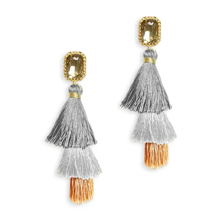 Make a statement, these earrings feature a beautiful rhinestone stud with trendy colored tassels.