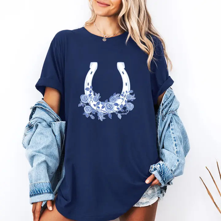 Blue Floral Horseshoe Navy T-Shirt #HPTS-NAVY-BLUHS
