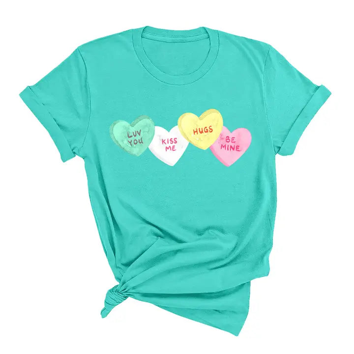 This Candy Hearts T-shirt is guaranteed to make your heart happy! Comfy & cute, this T-shirt looks great worn regularly, knotted, or even worn in a front-tuck! The classic fit paired with the fun design makes compliments guaranteed.